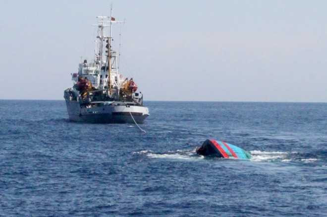 ![]() Một tàu cá của ngư dân miền Trung bị tàu nước ngoài đâm chìm được tàu cứu hộ kéo về. Ảnh: Minh Hoàng. |