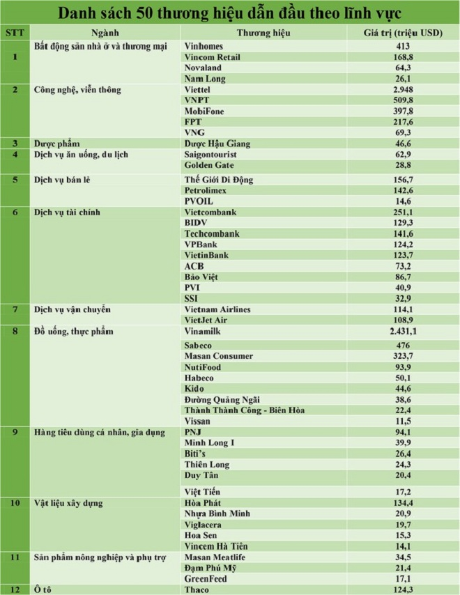 Danh sách 50 thương hiệu dẫn đầu năm 2020 được xếp theo từng ngành. Phần lớn có bề dày hoạt động trên 10 năm, thời gian đủ dài để các công ty khẳng định tên tuổi. Xét theo lĩnh vực, hai nhóm ngành có nhiều đại diện nhất gồm nhóm hàng thực phẩm - đồ uống và nhóm dịch vụ tài chính đều có 9 đại diện, chiếm tỷ trọng nhiều nhất xét theo số lượng, tiếp theo là bất động sản, công nghệ, nguyên liệu, bán lẻ.