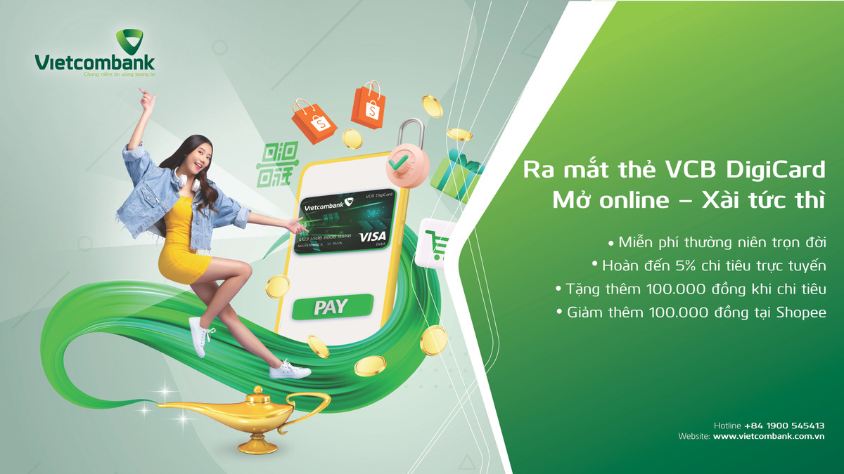 Nhân dịp ra mắt thẻ ghi nợ VCB DigiCard, Vietcombank triển khai nhiều chương trình khuyến mại đặc biệt hấp dẫn. Chi tiết các chương trình khuyến mãi và hướng dẫn phát hành thẻ, xem tại trang web: https://portal.vietcombank.com.vn/.