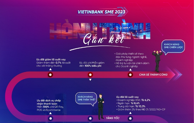 Năm 2023 đánh dấu mốc son 35 năm VietinBank xây dựng và phát triển. Nhân dịp này, VietinBank “tung” combo tài chính trọn gói “Hành trình gắn kết”, theo sát sự phát triển của doanh nghiệp vừa và nhỏ (SME) trong hành trình đồng hành cùng VietinBank. Cùng tìm hiểu combo tài chính trọn gói này qua infographic dưới đây.