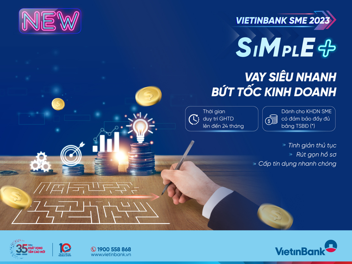 Song song với SME SIMPLE+, VietinBank còn triển khai gói tín dụng ưu đãi SME UP với lãi suất hấp dẫn chỉ từ 7%/năm và quy mô gói ưu đãi lên đến 10.000 tỷ đồng để hỗ trợ doanh nghiệp tiếp cận nguồn vốn giá rẻ, tiết giảm chi phí và phát triển kinh doanh. Những giải pháp và chương trình ưu đãi đồng hành cùng doanh nghiệp này nằm trong hành trình gắn kết doanh nghiệp SME với VietinBank và chuỗi hoạt động hướng tới kỷ niệm 35 năm thành lập VietinBank.