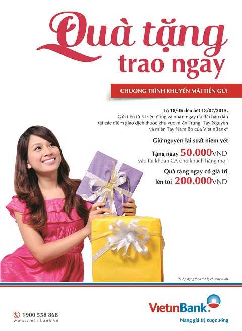 Từ 18/5 đến hết 18/7/2015, VietinBank triển khai chương trình khuyến mãi tiền gửi “Quà tặng trao ngay” với nhiều ưu đãi hấp dẫn.