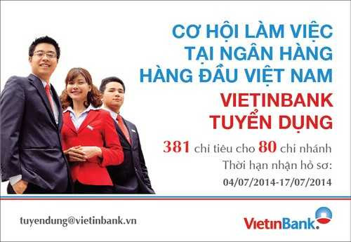 (VTC News) - VietinBank có nhu cầu tuyển dụng 381 cán bộ cho 80 chi nhánh trên toàn hệ thống. Thời hạn nộp hồ sơ đến 17/07/2014.