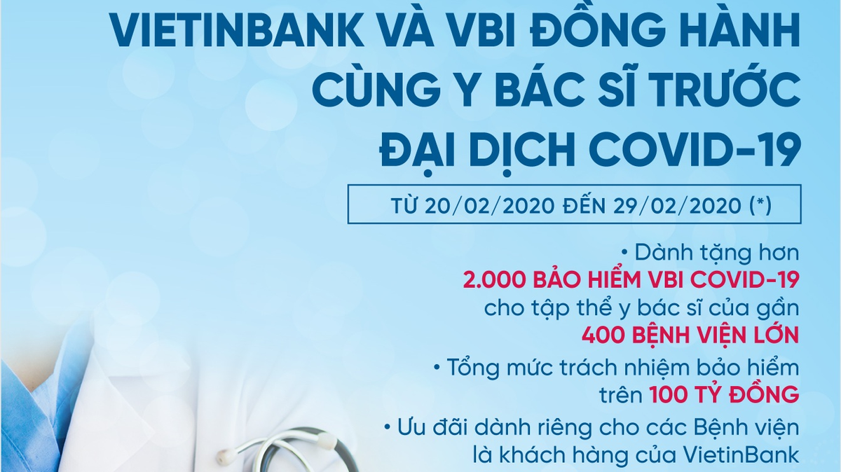 Cụ thể, từ ngày 20/2/2020 - 29/2/2020, VietinBank phối hợp cùng Tổng Công ty Bảo hiểm VietinBank (VBI) triển khai Chương trình “VietinBank và VBI đồng hành cùng các y, bác sỹ trước đại dịch COVID-19”. Trong Chương trình này, VietinBank dành tặng các bác sỹ tại các bệnh viện đang có quan hệ với VietinBank trên toàn quốc 2.000 Gói bảo hiểm COVID-19 với tổng mức trách nhiệm bảo hiểm trên 100 tỷ đồng.