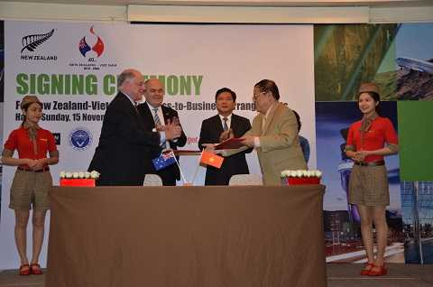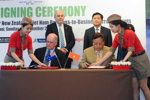 Ông Nguyễn Đức Tâm, Phó Tổng Giám Đốc Vietjet và Ông John Nicholson, Chủ tịch Hiệp hội hàng không New Zealand, đại diện hai bên ký kết biên bản ghi nhớ trước sự chứng kiến của Bộ trưởng bộ Phát triển kinh tế, Bộ Giáo dục kỹ năng Nghề Nghiệp, Ông Steven Joyce, Bộ trưởng Giao thông vận tải Việt Nam, Ông Đinh La Thăng và các quan chức cấp cao khác của hai nước.