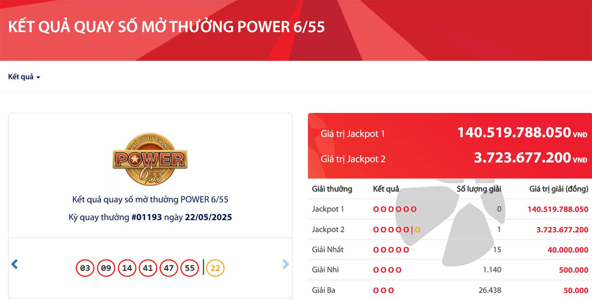 Thông tin từ Công ty Xổ số Điện toán Việt Nam (Vietlott) cho hay, trong kỳ quay số mở thưởng lần thứ 1193 của loại hình xổ số Power 6/55 diễn ra vào tối nay (22/5), Hội đồng quay thưởng của Vietlott xác định giá trị giải thưởng độc đắc Jackpot 1 là 140.519.788.050 đồng (hơn 140,5 tỷ đồng). Tuy nhiên, chưa có người chơi nào may mắn trúng giải độc đắc này.