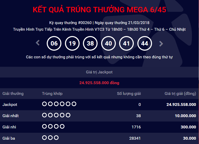 Kết quả xổ số Vietlott kỳ quay gần đây nhất ngày 21/3, không có người may mắn nào trúng giải độc đắc. Dãy số may mắn ghi nhận trong kỳ quay vừa qua lần lượt là :06 - 19 – 38 – 40 – 41 – 44.
