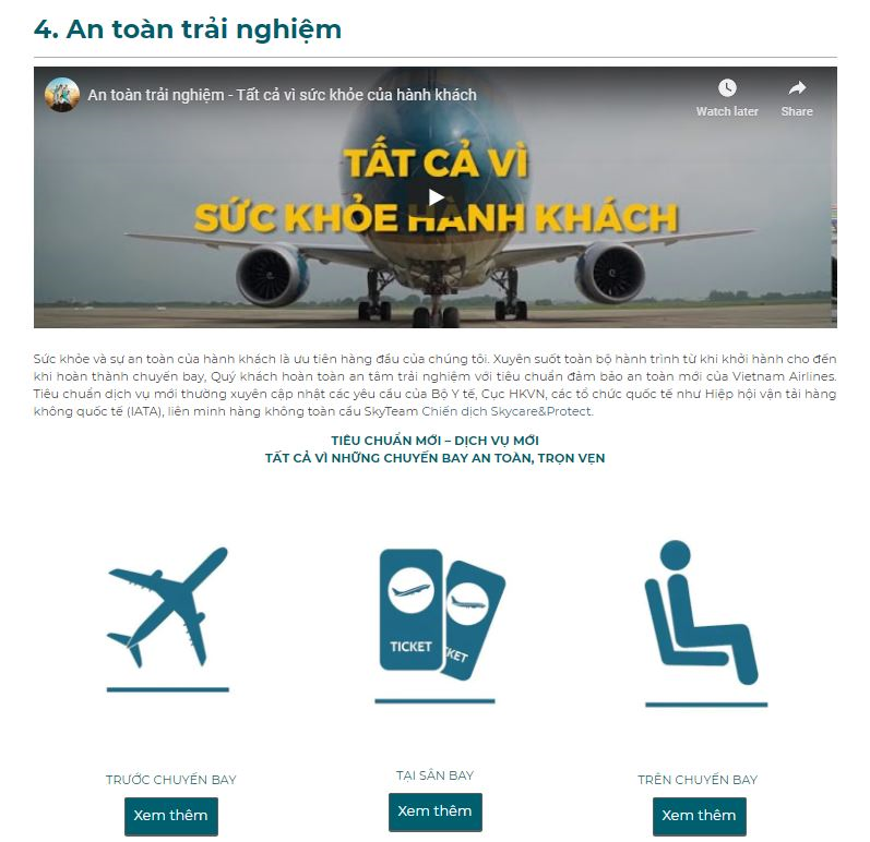 Để thuận tiện cho hành khách tra cứu, cập nhật thông tin, Vietnam Airlines đã chủ động xây dựng chuyên mục An toàn trải nghiệm hiển thị nổi bật ngay trên trang chủ website www.vietnamairlines.com. Hành khách có thể tự tìm hiểu các quy định của nhà chức trách và Vietnam Airlines về phòng chống dịch bệnh khi đi máy bay, cũng như các lưu ý cần thiết tại chuyên trang này. Bên cạnh đó, hành khách được cập nhập liên tục và thường xuyên về các tiêu chuẩn phục vụ mới của Hãng trong nỗ lực bảo đảm an toàn sức khỏe cho cộng đồng.