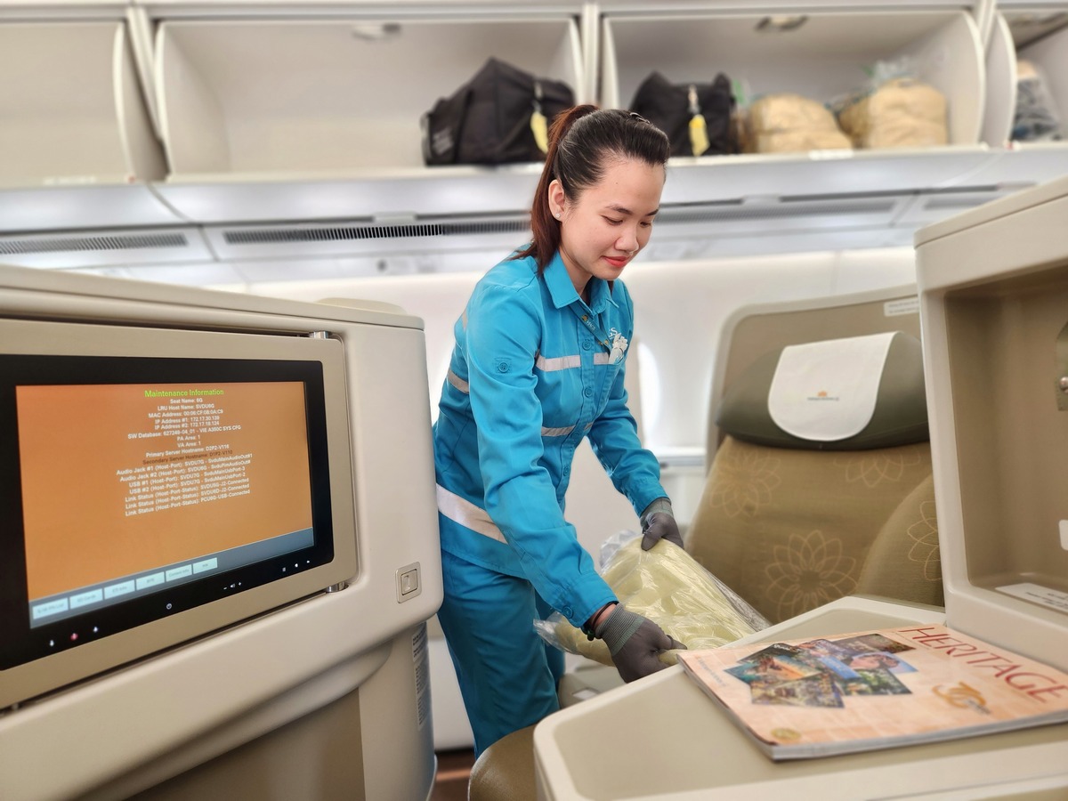 Theo chị Phượng, mỗi một máy bay sẽ có đội vệ sinh gồm 6 người (máy bay thân hẹp) và 14 người (máy bay thân rộng), trong đó sẽ phân công thực hiện tại nhiều vị trí như: Khu vực bếp, kiểm tra và sắp xếp tạp chí để trong ngăn ghế, trải những tấm khăn mới lên lưng ghế, vuốt cho khăn ghế thật phẳng, bắt chéo dây an toàn, sắp xếp túi nôn, để bảng an toàn bay nhô cao trên mép túi để hành khách dễ nhận diện, hút bụi mặt sàn, vệ sinh toilet, dọn rác…