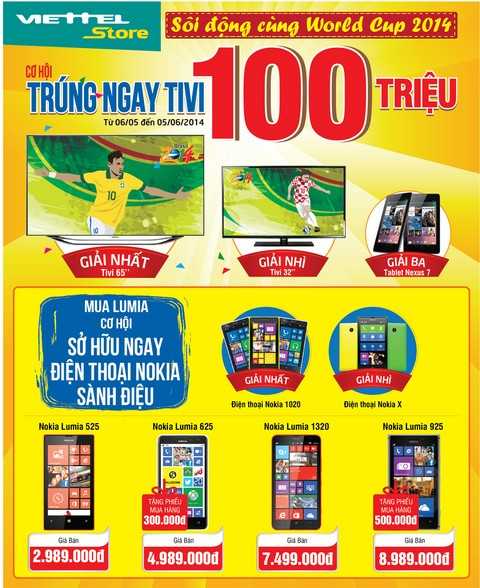 Nắm bắt tâm lý này, hệ thống bán lẻ Viettel mang đến cơ hội sở hữu tivi trị giá 100 triệu đồng cho mọi khách hàng có hóa đơn trị giá từ 300.000 đồng trở lên. Chương trình được triển khai từ 6/5 đến 5/6/2014.Trong chương trình này, với mỗi hóa đơn mua hàng 300.000 đồng Quý khách sẽ có ngay một cơ hội trúng thưởng tivi màn hình 65 inches trị giá 100 triệu đồng. Mua càng nhiều cơ hội trúng thưởng sẽ càng lớn. Ngoài ra Quý khách còn cơ cơ hội sở hữu nhiều giải thưởng hấp dẫn khác như tivi 32 inches và máy tính bảng Nexus 7 khi mua hàng tại hệ thống bán lẻ Viettel.