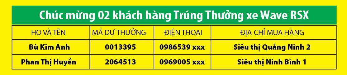 Cũng trong ngày quay số 8/3 Hệ thống bán lẻ Viettel tìm ra 2 khách hàng may mắn sở hữu xe máy Wave RSX. Chi tiết khách hàng trúng thưởng như sau: