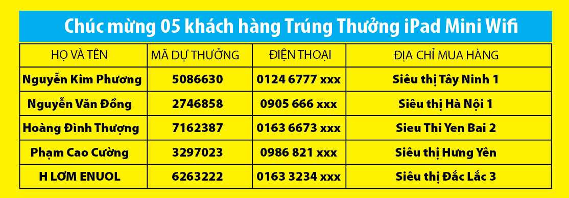 Cùng với đó là 05 máy tính bảng iPad mini wifi 16Gb dành cho 05 khách hàng may mắn: Xin chúc mừng các khách hàng có tên dưới đây: