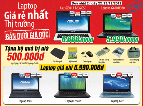 Cụ thể với cấu hình cao, hình dáng nhỏ gọn và trọng lượng nhẹ, laptop Asus X301A B832G50 giá chỉ 6.666.000 đồng, Laptop Lenovo G480 B980 giá chỉ 5.990.000 đồng.