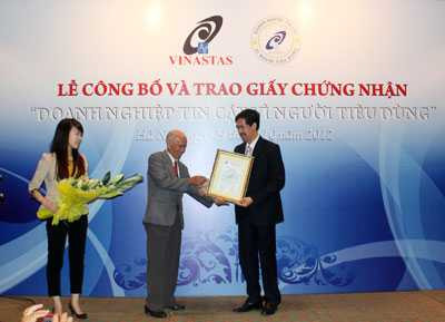 (VTC News) - Ngày 9.10.2012, tại Hà Nội, Hội Tiêu chuẩn và Bảo vệ Người tiêu dùng Việt Nam (VINASTAS) đã tổ chức trọng thể Lễ công bố và trao giấy chứng nhận “Doanh nghiệp tin cậy vì người tiêu dùng”. Tại chương trình, VINASTAS đã công bố và trao giấy chứng nhận cho Công ty Cổ phần sữa Việt Nam – Vinamilk, là doanh nghiệp đầu tiên vinh dự được công nhận là Doanh nghiệp tin cậy vì người tiêu dùng.