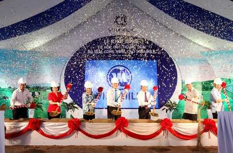 | Các đại biểu tiến hành nghi thức động thổ, khởi công dự án tổ hợp các trang trại bò sữa công nghệ cao Vinamilk tại Thanh Hóa. Tổng vốn đầu tư ban đầu cho dự án này là 1.600 tỷ VND. Dự án có tổng diện tích 2.500 ha (25 triệu m2), trong đó có 147 ha để xây dựng trang trại và 1600 ha để phát triển nguyên liệu thức ăn thô xanh cho đàn bò |