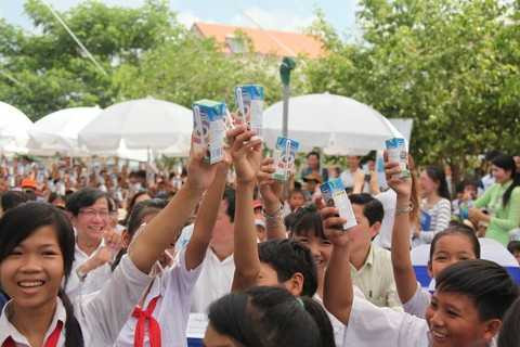 | Niềm vui nhận sữa của trẻ em huyện Ba Tri, Bến Tre |