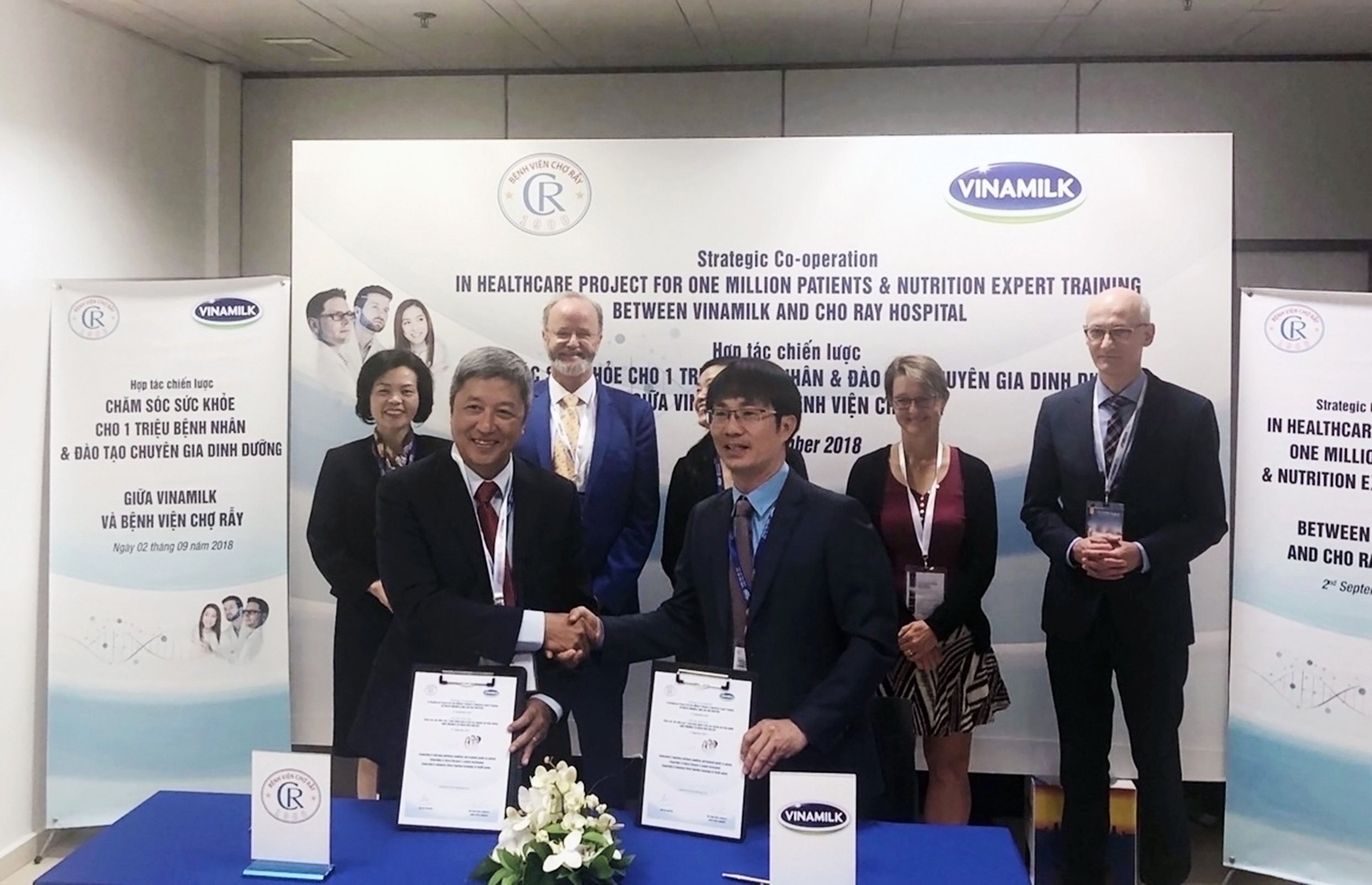 Trong khuôn khổ hội nghị dinh dưỡng lâm sàng quốc tế tổ chức tại trung tâm hội nghị IFEMA, thành phố Madrid, Tây Ban Nha, Công ty cổ phần Sữa Việt Nam (Vinamilk) và Bệnh Viện Chợ Rẫy đã cùng ký kết Hợp tác chiến lược tiếp tục 3 năm 2019-2021 về vấn đề “Chăm sóc dinh dưỡng, phát triển sản phẩm chuyên biệt cho Bệnh nhân điều trị nội ngoại trú và đào tạo chuyên gia dinh dưỡng lâm sàng chuyên sâu với tiêu chuẩn quốc tế” với sự tham dự, chứng kiến và hỗ trợ của các Giáo sư đến từ Bệnh viện Đại học Geneva.