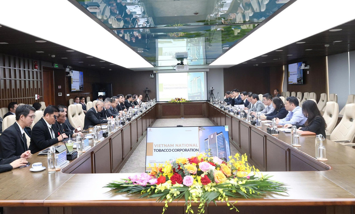 Toàn cảnh buổi làm việc giữa Tổng công ty Thuốc lá Việt Nam (Vinataba) và đoàn lãnh đạo Tổng cục Thuốc lá Thái Lan (TOAT) tại Hà Nội, sáng 8/12/2025.
