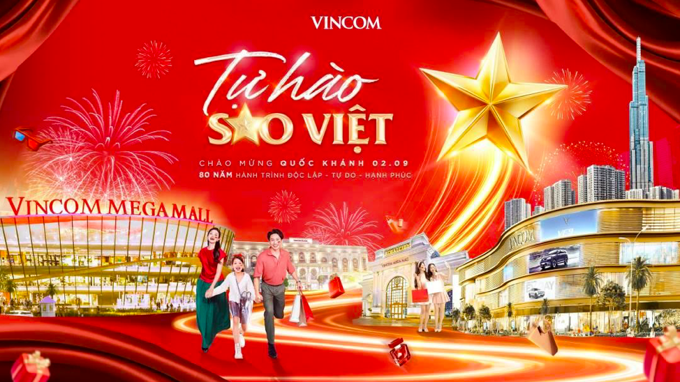 Nhằm chào mừng 80 năm Quốc khánh nước CHXHCN Việt Nam, 88 trung tâm thương mại Vincom trên toàn quốc sẽ đồng loạt chuyển giao diện sắc đỏ vàng Quốc kỳ, thắp lên không khí lễ hội và lan tỏa niềm vui Độc lập - Tự do - Hạnh phúc của dân tộc. Chiến dịch “Tự hào Sao Việt” sẽ kéo dài từ nay tới ngày 5/9 với nhiều ưu đãi độc quyền, lên tới 50% tại hơn 2.600 gian hàng trên cả nước.