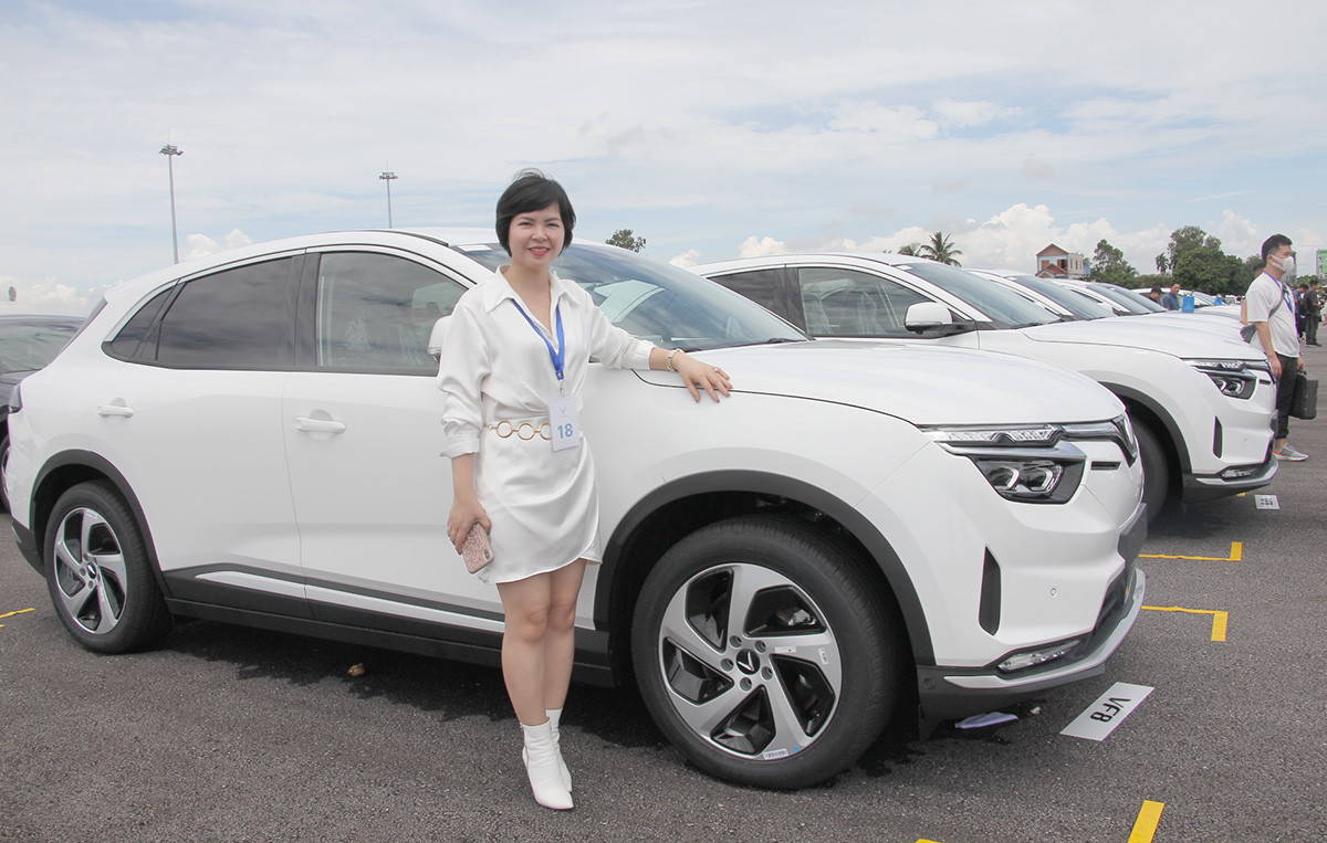 Chị Phan Bích Ngọc (SN 1983, ở Cầu Giấy, TP Hà Nội) bên chiếc xe VF 8 màu trắng mà chị yêu thích nên đặt mua đầu tiên.