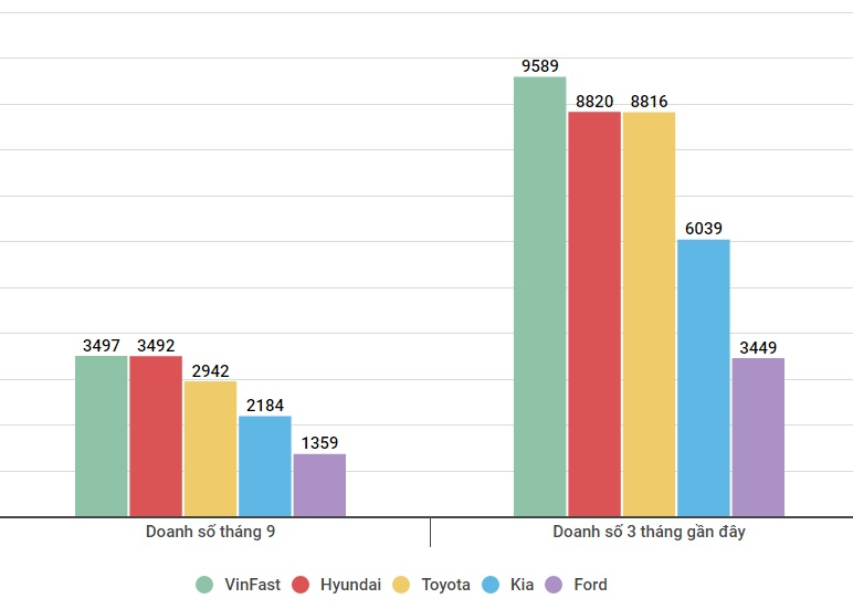 Doanh số tháng 9 và 3 tháng gần nhất của 5 thương hiệu xe con bán chạy nhất Việt Nam.