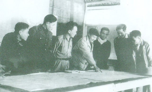 Ông Đào Văn Trường - Tham mưu trưởng (người chỉ tay) báo cáo Đảng ủy chiến dịch Trần Hưng Đạo kế hoạch tác chiến, tháng 12/1950, tại xã Hợp Thành, Phú Lương, Thái Nguyên. (Ảnh tư liệu)