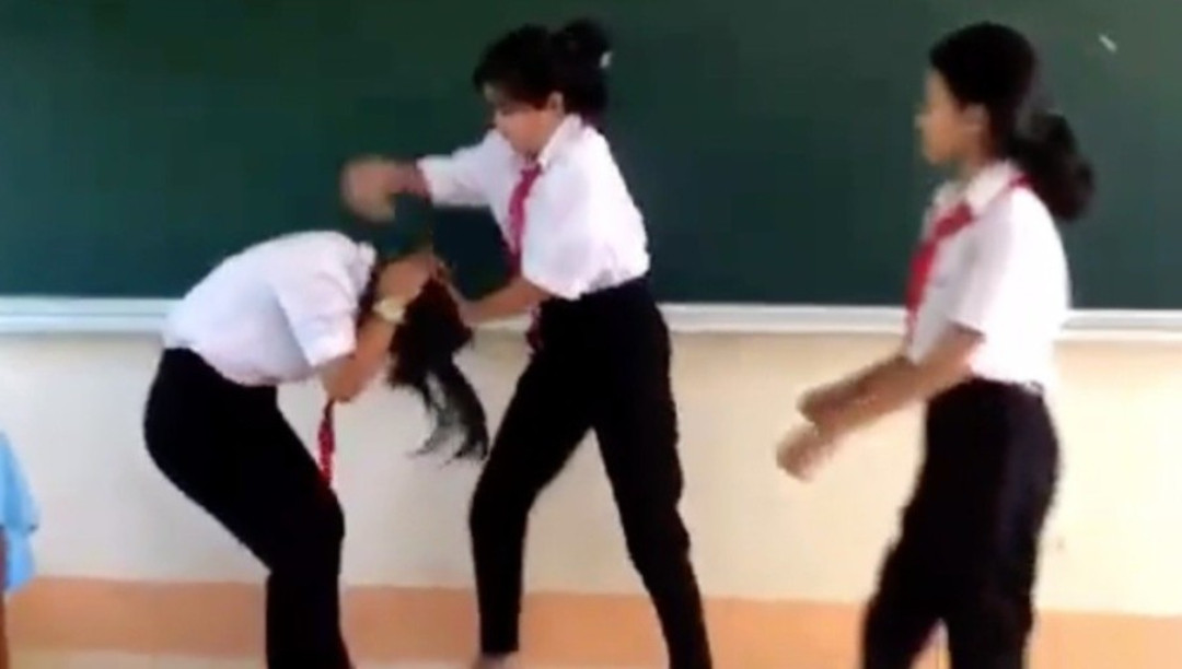 Trước đó, trên mạng xã hội xuất hiện đoạn clip ghi lại cảnh một nữ sinh bị một nhóm nữ sinh khác đánh tới tấp bằng tay, chân và mũ bảo hiểm ngay trên bục giảng của lớp học. Mặc dù, nữ sinh bị đánh khóc lóc, chắp tay xin tha nhưng vẫn bị bạn đánh tới tấp.