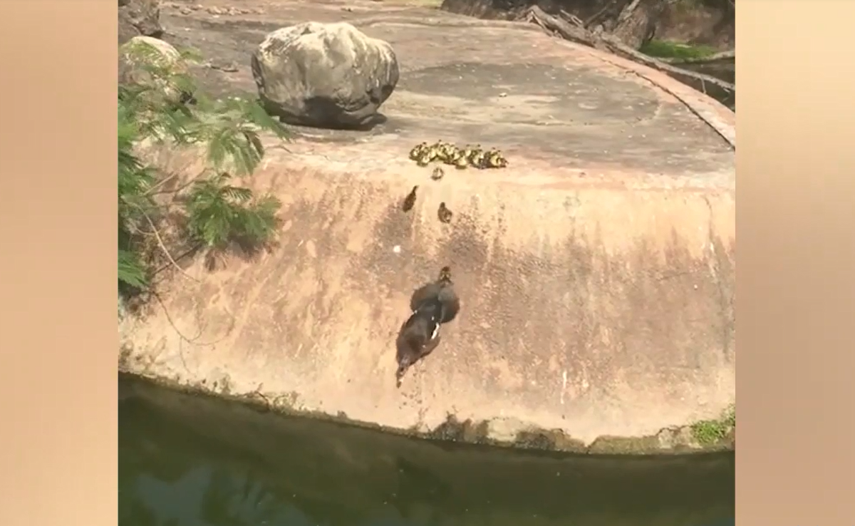 Vịt mẹ lỡ trượt chân ngã xuống hồ, cả đàn con bắt chước