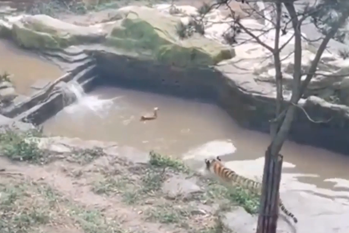 Chú vịt nhanh nhẹn thoắt ẩn, thoắt hiện dưới nước khiến hổ dù bị trêu đến phát cáu cũng chịu thua.