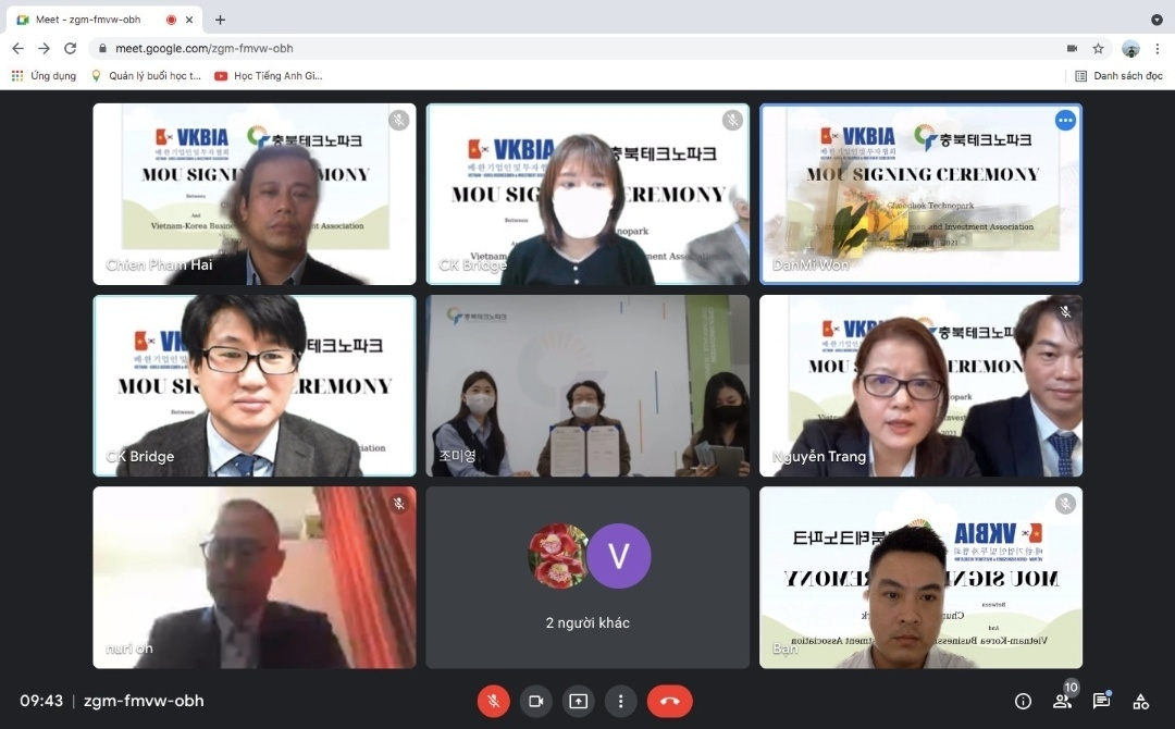 Hôm 26/11, Hiệp hội Doanh nhân & Đầu tư Việt Nam - Hàn Quốc (VKBIA) – đại diện khu vực phía Nam Việt Nam và Công viên Công nghệ tỉnh Chungbuk (Chungbuk Technopark) ký kết trực tuyến thỏa thuận hợp tác toàn diện về phối hợp quảng bá, đào tạo kết hợp chuyển giao công nghệ, liên kết hợp tác phát triển địa phương với nhiều nội dung và chương trình hợp tác cụ thể.