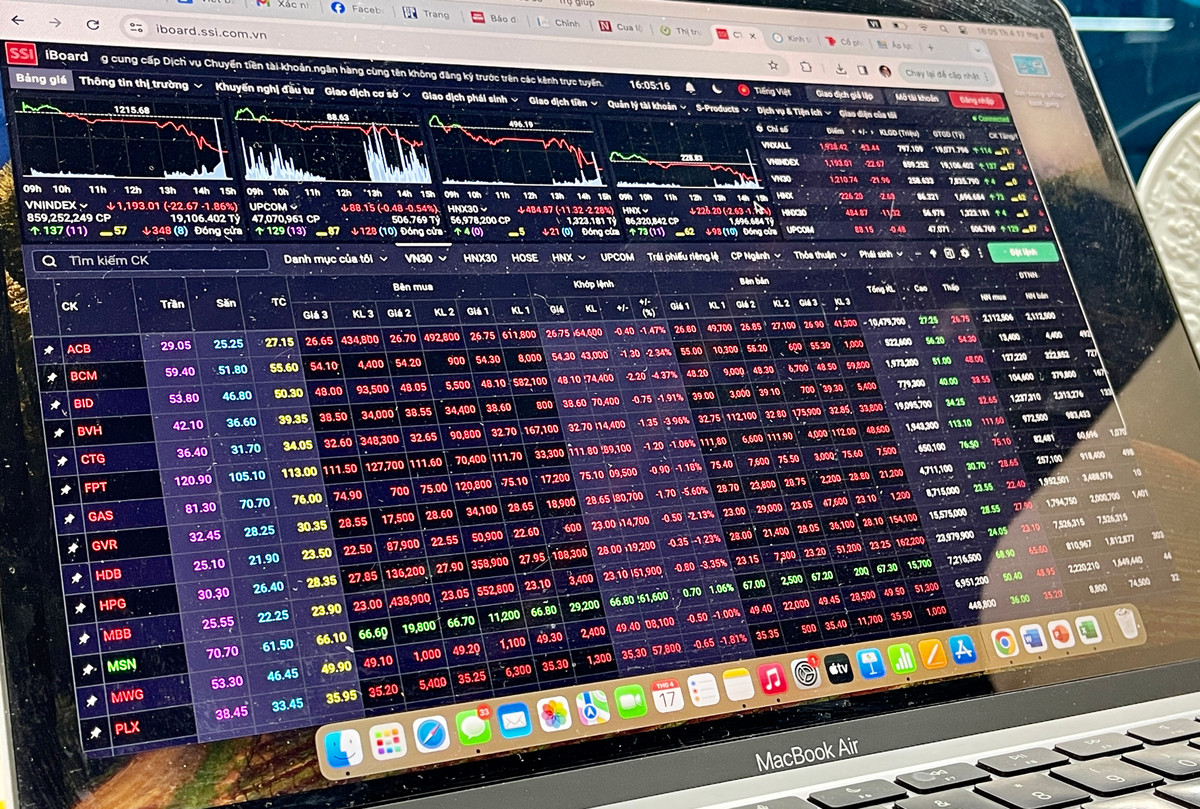 Cụ thể, VN-Index giảm 22,67 điểm, xuống 1.193,01 điểm. Trên sàn HoSE, khối lượng giao dịch đạt hơn 859,2 triệu đơn vị, tương ứng hơn 19.106,4 tỷ đồng. Toàn sàn có 137 mã tăng giá, 348 mã giảm giá và 57 mã đứng giá.