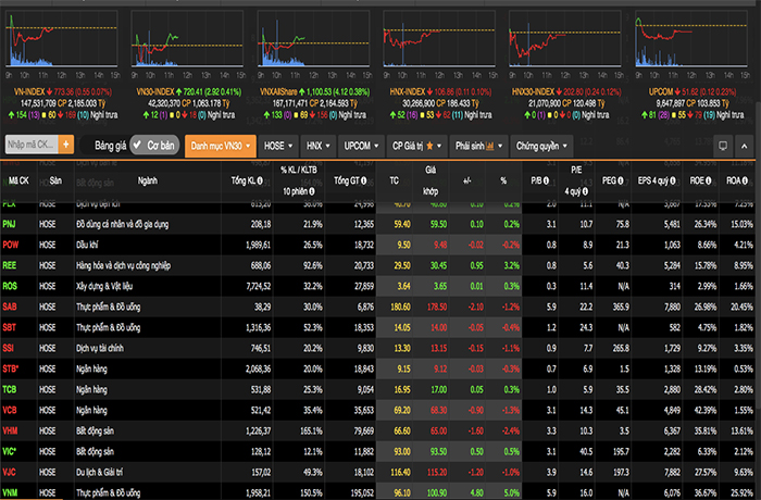 Rổ VN30 tăng 2,9 điểm lên 720 điểm, tức tăng 0,41%. Toàn sàn có 12 mã tăng, 19 mã giảm, không có mã nào “nằm sàn”. Thanh khoản đạt hơn 1.000 tỷ đồng. VNM là cổ phiếu tăng mạnh nhất VN30 với 5% lên 100.900 đồng/cổ phiếu. Mã giảm mạnh có VHM giảm 2,4%, MWG giảm 1,2%...
