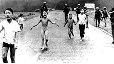 | Bức ảnh chụp bé gái Kim Phúc đang kêu khóc, thân thể bị cháy sém vì bom napalm trong một trận càn ở Trảng Bàng (Tây Ninh) năm 1973. |