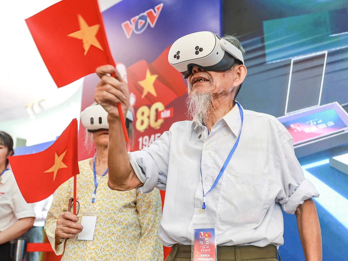 Trong khán phòng VR, từng tốp người cùng đeo kính thực tế ảo. Không gian quảng trường Ba Đình năm 1945 hiện về: Lá cờ đỏ sao vàng tung bay, hàng vạn đồng bào chen chật, và giọng Bác Hồ vang lên, trầm hùng: “Hỡi đồng bào cả nước…”.