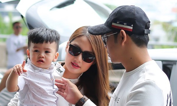 Vợ chồng Ngọc Lan diện trang phục năng động ra sân bay.