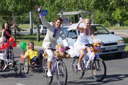 | Cặp vợ chồng Nina và Artur Sakhabutdinoyi trong lễ cưới độc đáo với màn rước dâu bằng xe đạp. Ảnh: Nina Aktuganova/Tiếng nói nước Nga |