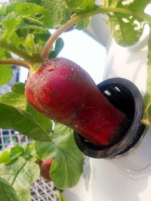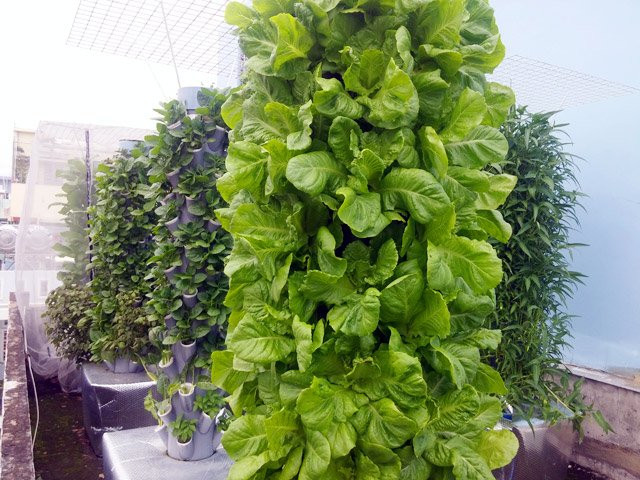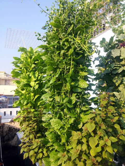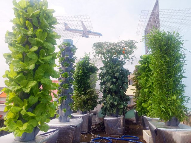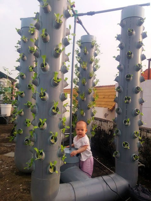 Sân thượng nhà anh rộng 25m2 nhưng toàn bộ vườn rau chỉ chiếm 10m2. Ở khu vườn nhà anh hầu như là không cần đến đất, anh chỉ áp dụng phương pháp khí canh và thủy canh trụ đứng hồi lưu. Khi trồng cây dạng này, rễ cây nằm hoàn toàn trong không khí ở các hốc đặt trên trụ cao.
