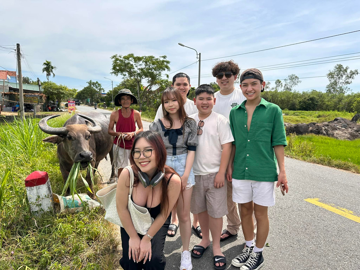 Ba quý tử của nam ca sĩ cùng các anh chị em họ hào hứng chụp hình lưu niệm với chú trâu mà họ bắt gặp bên vệ đường khiến Trizzie Phương Trinh bật cười: