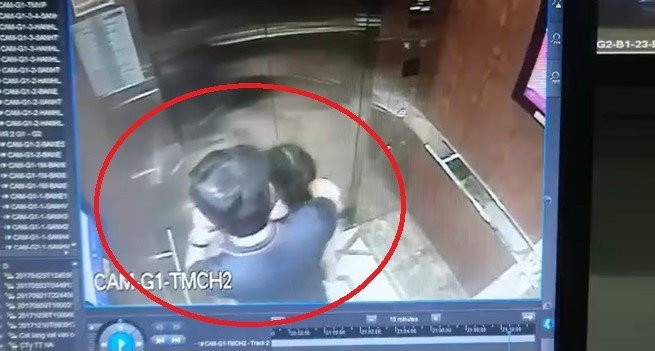 Người đàn ông này nói chuyện với nam bảo vệ sau đó dùng thẻ quét, bấm chọn tầng. Khi nam bảo vệ bước đi, cửa thang máy đóng thì người đàn ông ôm bé gái vào lòng, hôn tới tấp.