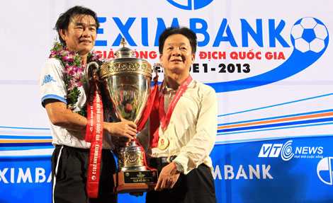 | Bầu Hiển nâng Cup vô địch cùng Hà Nội T&T (Ảnh: Quang Minh) |