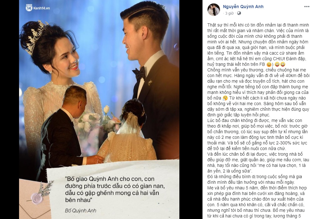 "Thật sự thì mỗi khi có tin đồn nhảm lại đi thanh minh thì rất mất thời gian và nhàm chán. Việc của mình là sống cuộc đời của mình chứ không phải đi thanh minh với ai hết. Nhưng chuyện đồn nhảm ngày hôm qua đã đi qua xa, quá giới hạn, và mình buộc phải lên tiếng", Quỳnh Anh, vợ Duy Mạnh chia sẻ trên mạng xã hội.