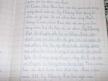 Đây là cuốn vở in chữ sẵn cho học sinh nhìn để luyện chính tả theo. Trang 5 có đoạn viết: “Quân Nam Hán đưa một đạo quân rất đông sang đánh nước ta. Lý Thường Kiệt dùng kế chôn cọc gỗ đầu bịt sắt nhọn dưới sông Bạch Đằng. Quân Nam Hán đến cửa sông vào lúc thủy triều lên che lấp các cọc nhọn.