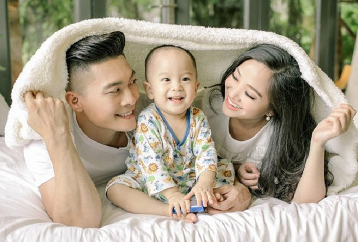 Vợ chồng nghệ sĩ hạnh phúc bên con trai đầu lòng.