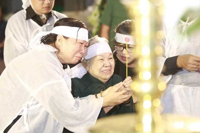 | Bà Phạm Thị Vân - vợ nhạc sĩ Phan Huỳnh Điểu không kìm nén được sự xúc động khi đứng trước linh cữu chồng. Những ngày qua, do sức khỏe yếu và đang nằm viện, bà không được con cháu cho hay tin chồng mất. Hơn 60 năm gắn bó, tình cảm của vợ chồng nhạc sĩ luôn được người thân ngưỡng mộ. |