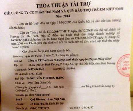 Thỏa thuận tài trợ 50 tỷ đồng cho Qũy bảo trợ trẻ em Việt Nam của vợ chồng đại gia Dũng "lò vôi". Ảnh: Phan Cường