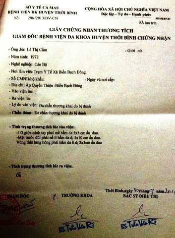 Theo giấy chứng nhận thương tích đề ngày 30/9 của Bệnh viện đa khoa Thới Bình, bệnh nhân Lê Thị Cẩm bị 3 vết thương phầm mềm ở cánh tay phải, đùi phải và lưng hông phải (lần lượt là 5x5cm, 5x10cm và 2x3cm ấn đau).