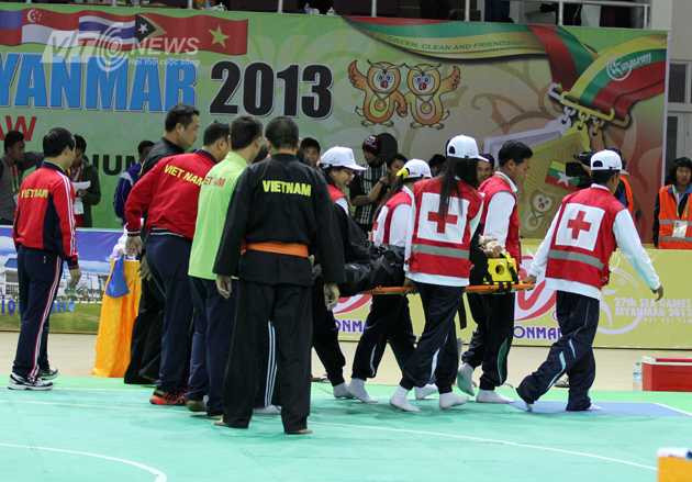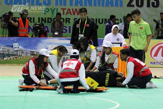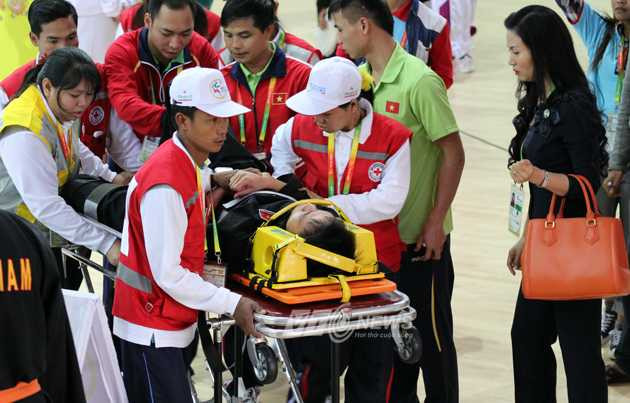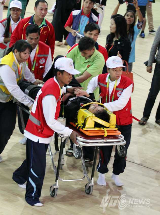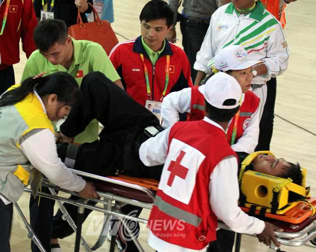 Anh được các nhân viên y tế đưa ra khỏi sân đấu bằng cáng. Tại phòng y tế của nhà thi đấu Zeyar Thiri, Toàn Thắng được xác định bị lật cổ chân.