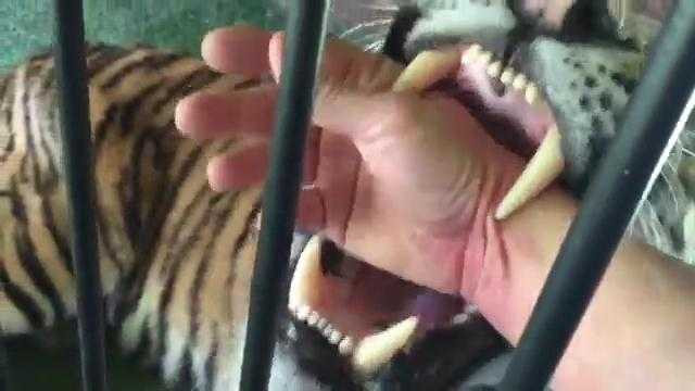 Người đàn ông vô tư cho tay vào chuồng hổ để chú gặm.