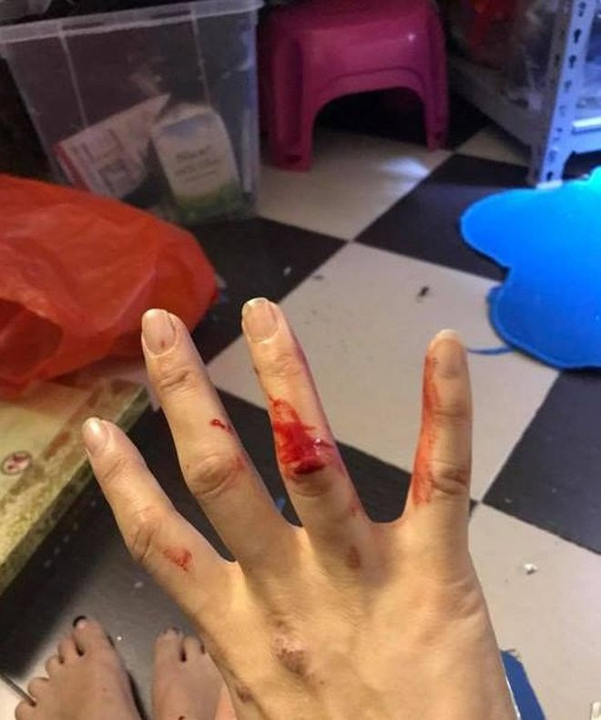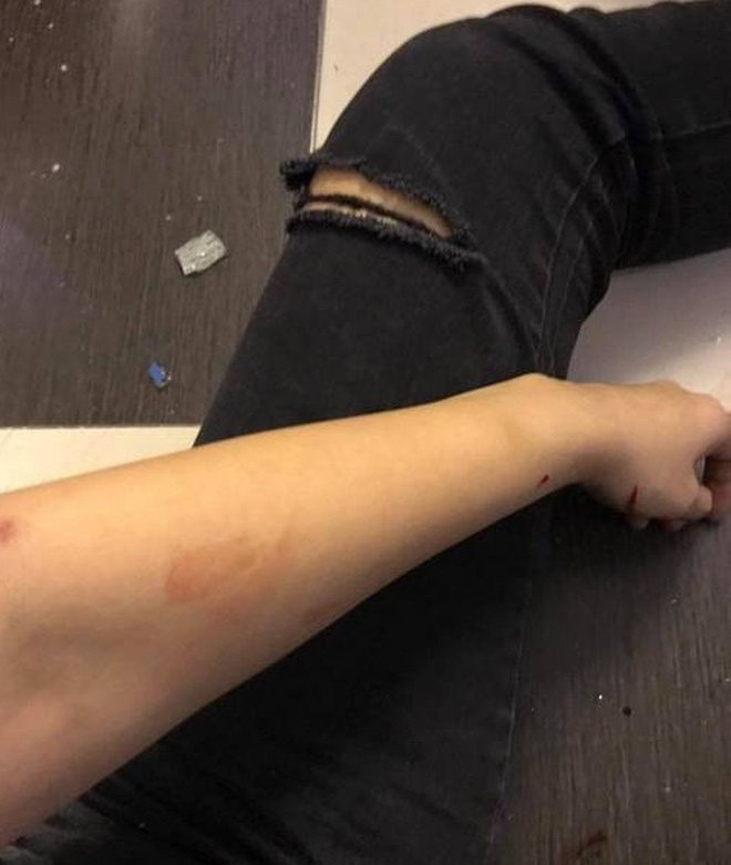 Cánh tay chảy máu và gương vỡ khắp sàn nhà. (Ảnh: FBNV).