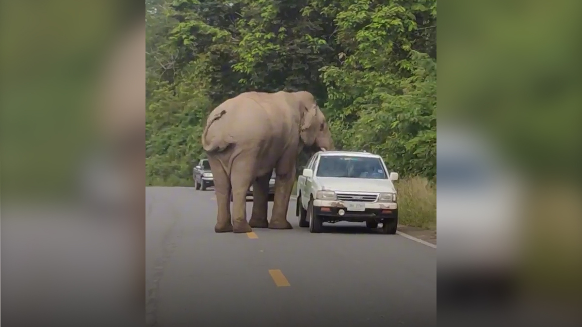 Con voi chặn những chiếc xe ô tô trên quốc lộ ở tỉnh Prachuap Khiri Khan, Thái Lan để đánh hơi tìm kiếm thức ăn.